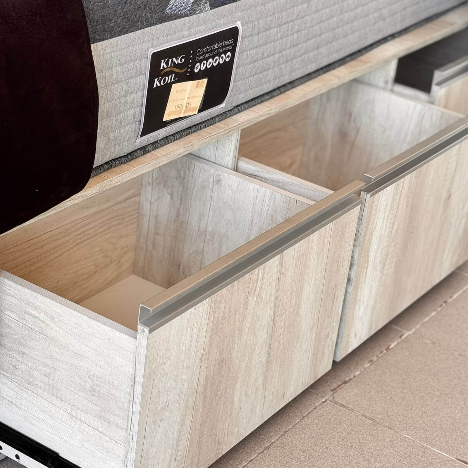 Enchapado en cantos de PVC de 2mm. Manijones de aluminio. Correderas telescópicas. Cajones con mucha capacidad de alamcenaje.