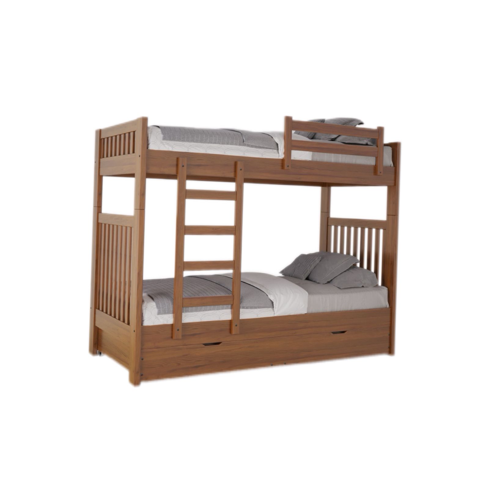 Cucheta desmontable de madera con dos camas paralelas, baranda y escalera.