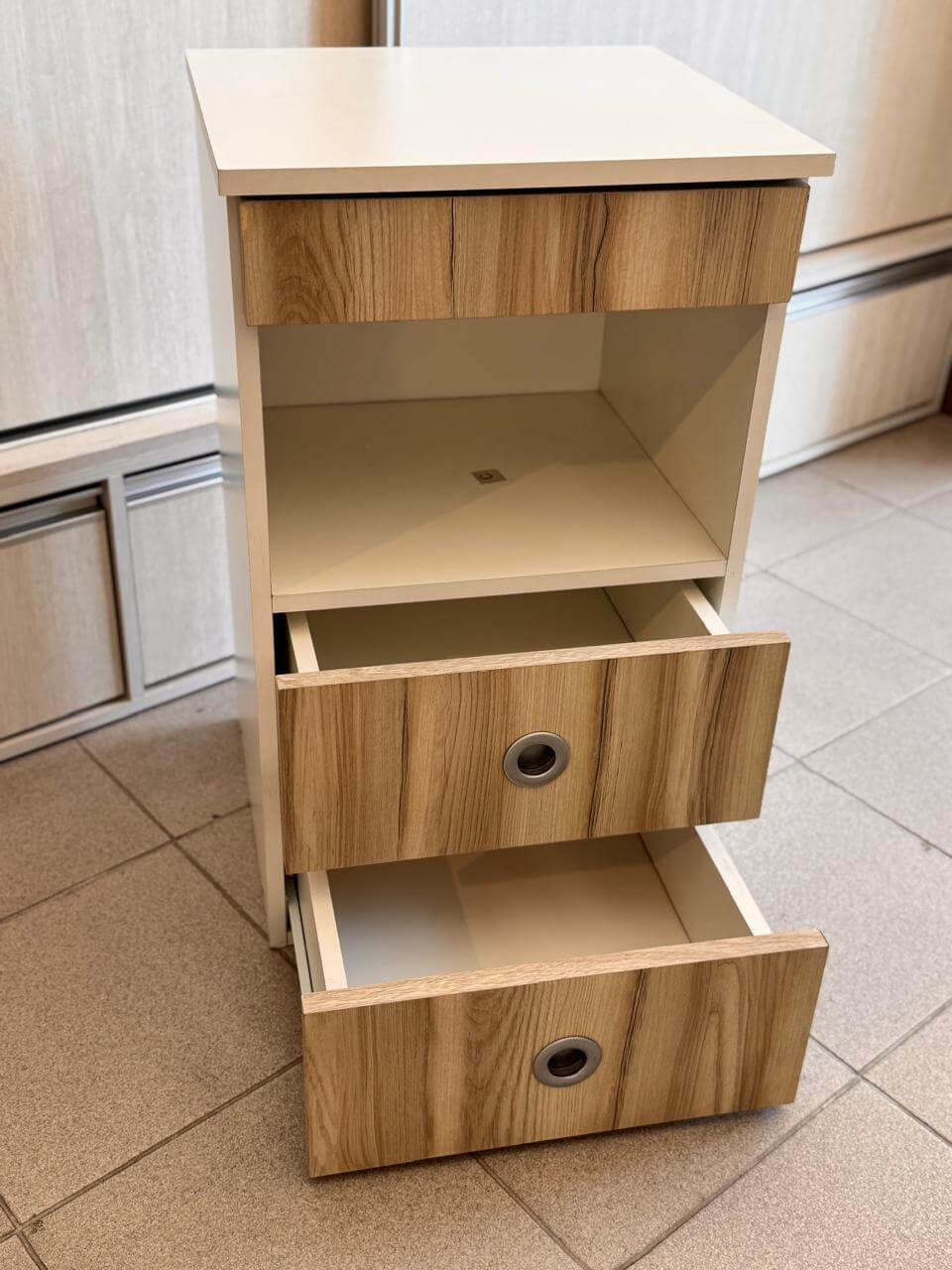 Cuenta con regatones antihumedad, correderas metálicas, 2 cajones frontales exteriores, manijas minimalistas embutidas, con diseño moderno. El interior del producto es del mismo color.