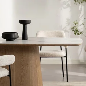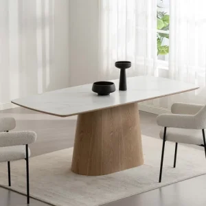 Mesa en forma rectangular con bordes redondeados enchapada en roble americano color madera natural. Tapa en piedra de Calacatta.