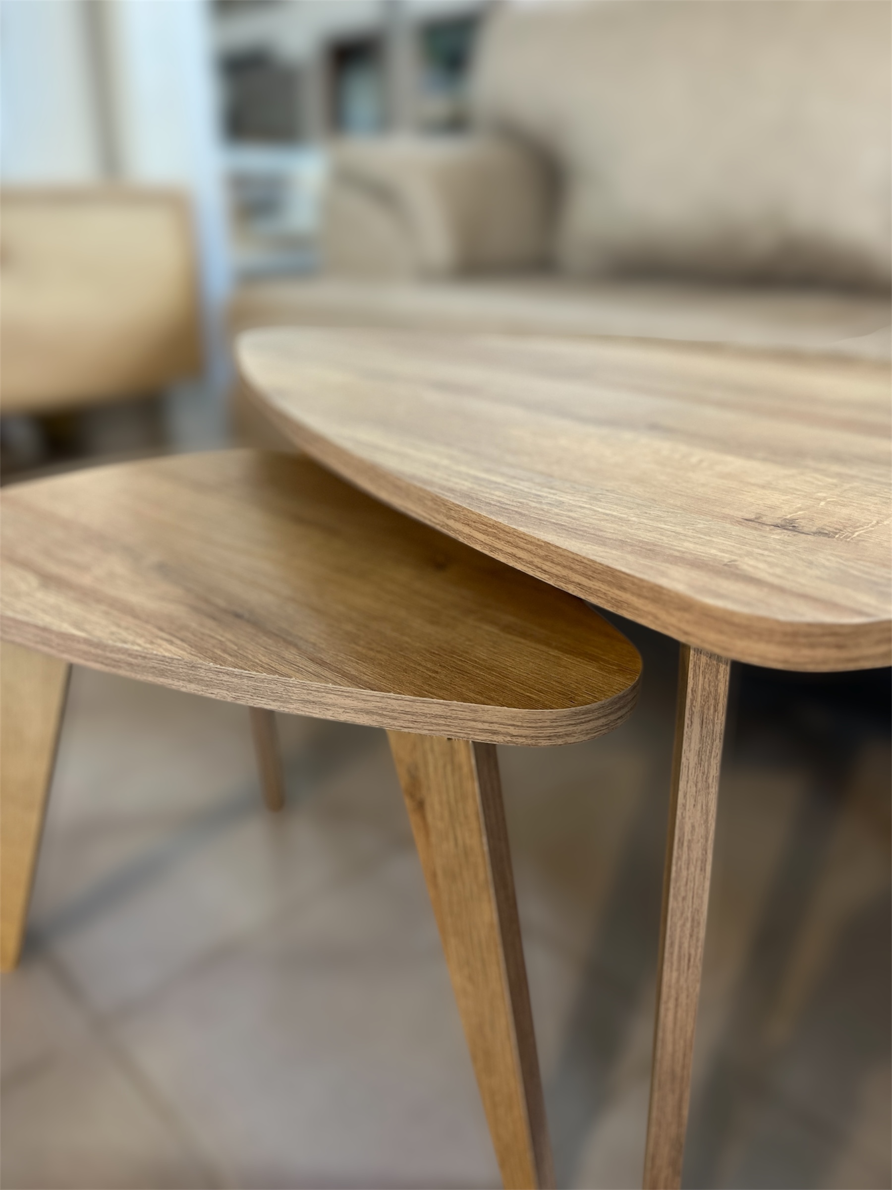 Renová tu living con este elegante set de mesas nido ovales en madera natural. Diseño minimalista y funcional: dos mesas superpuestas que combinan estética mid-century y líneas modernas, perfectas para espacios pequeños o ambientes contemporáneos.
