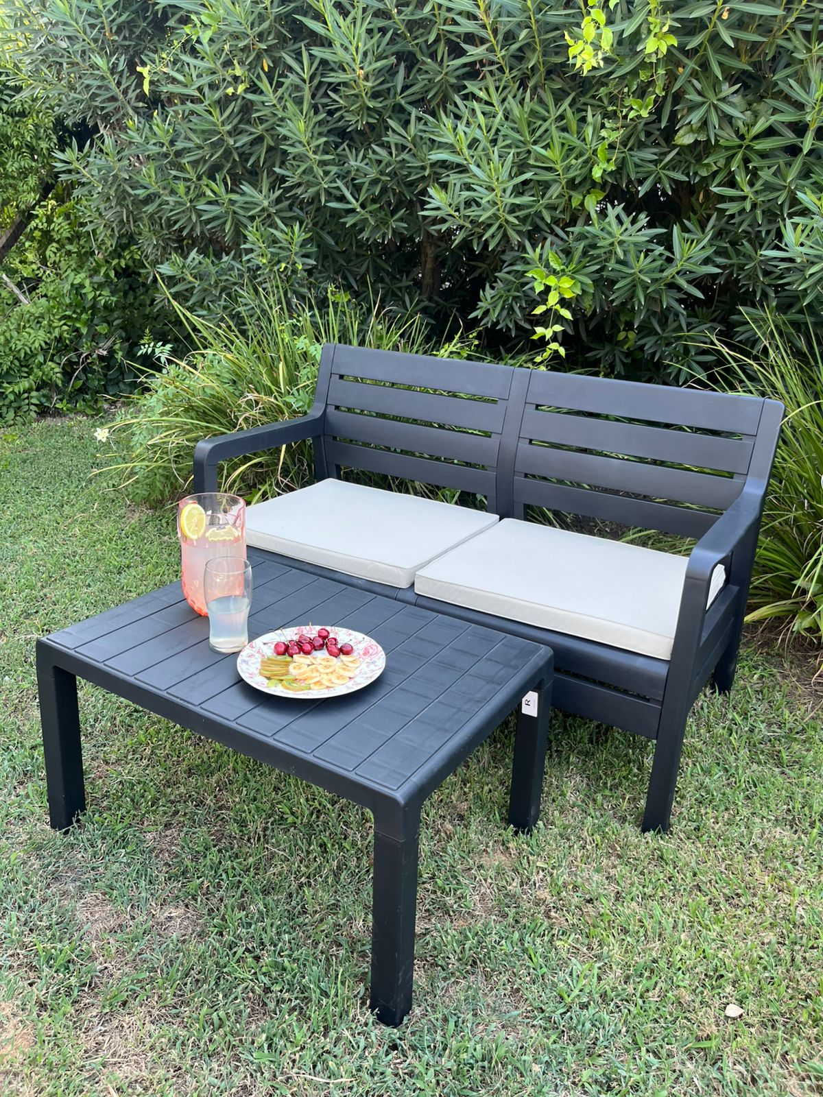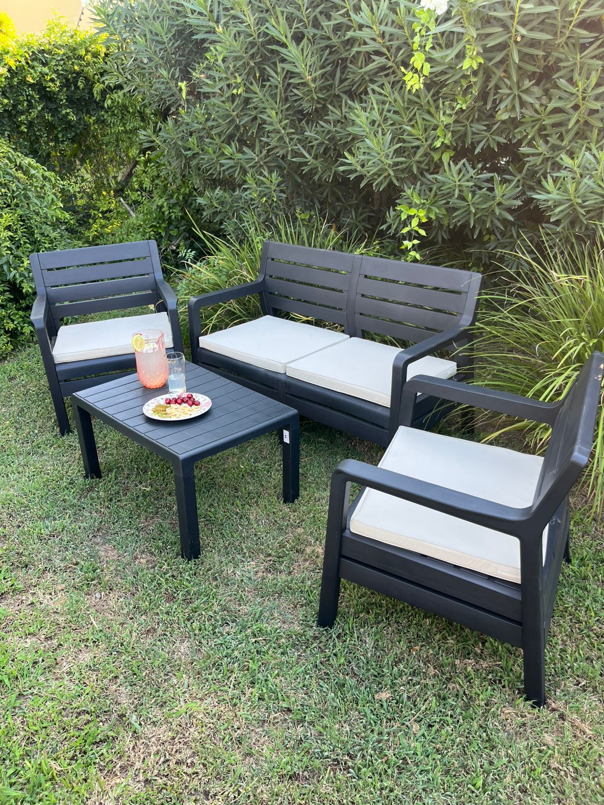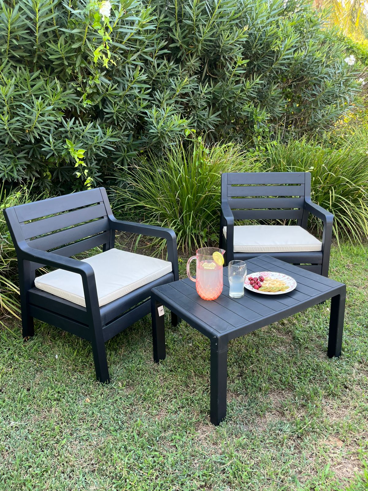 El complemento ideal para tu espacio. Ofrece un confort único. Contiene almohadones de tela impermeable y tanto los sillones como la mesa cuentan con tacos antideslizantes.
